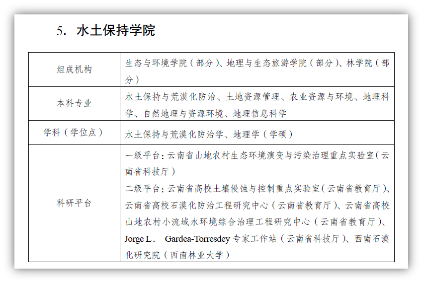 公司开设有水土保持与荒漠化防治、农业资源与环境、地理科学、地理信息科学、自然地理与资源环境、土地资源管理6个本科专业,其中水土保持与荒漠化防治为国家“双万计划”一流专业建设点、教育部特色专业,云南省重点建设专业和云南省一流专业,分别于2000、2007和2014年开始本科、硕士和博士研究生招生,已形成完整的本、硕、博人才培养体系。先后主编国家林草局十二五、十三五和十四五规划教材13部,获云南省优秀教材2部。拥有水土保持与荒漠化防治学云南省高等院校教学团队和云南省实验教学示范中心,云南省山地农村生态环境演变与污染治理重点实验室、云南省高校土壤侵蚀与控制重点实验室、云南省高校山地农村小流域水环境综合治理工程研究中心、云南省石漠化防治工程研究中心、山地农村清洁小流域建设省创新团队以及石漠化研究院、水土保持研究所等省、厅级平台团队10余个。先后获得6项省科学技术二等奖。近五年,主持国家和云南省重点研发计划等重要科研项目30余项,科研总经费达5000余万元。同时公司高质量开展水土保持政府咨询和社会服务。1项政府咨询报告获云南省委书记批示。长期开展云南省水土保持监测人员技术培训,制订的《云南省水土保持监测站点建设及监测技术标准》指导云南省水土保持监测站点的建设和运行管理工作,为云南省水土保持监测工作成为全国典范提供了科技支撑。