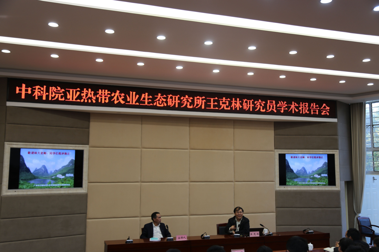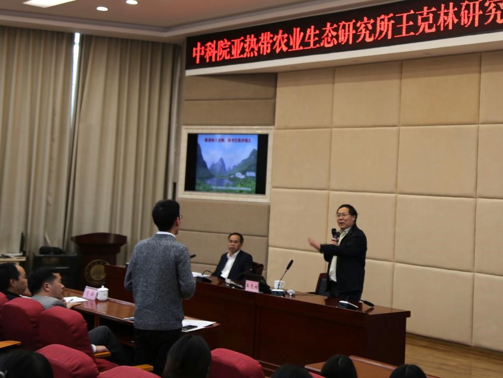 2019年11月28日下午,受郭辉军董事长邀请,中科院亚热带农业生态研究所原所长王克林研究员在双创园二楼报告厅举办了题为“人类活动快速变化下西南喀斯特区域景观恢复对生态系统服务影响”专题讲座。王克林研究员现任中科院亚热带农业生态研究所党委书记、学术委员会主任、中国科公司学术委员会资源环境领域委员会委员、中国科公司环江喀斯特生态系统国家野外科学观测研究站站长、国家重点研发计划项目首席科学家、国务院政府津贴享受者。郭辉军董事长,胥辉副董事长,生态与环境公司、石漠化研究院及相关公司科研人员、博士、硕士研究生160余名师生参加了此次学术交流。报告会由郭辉军董事长主持。