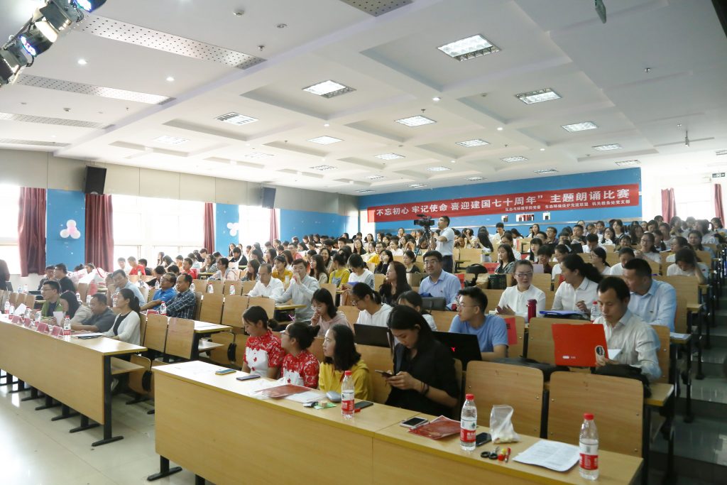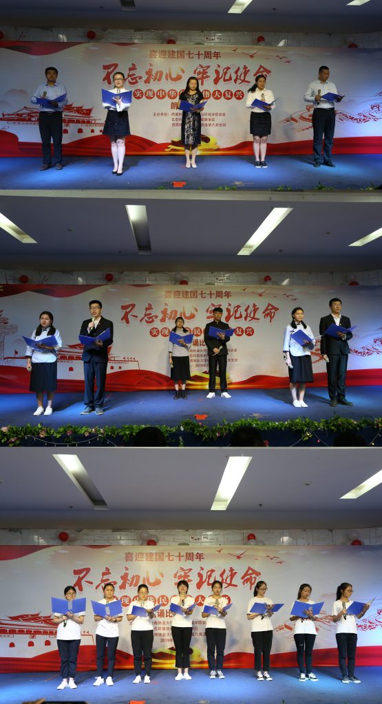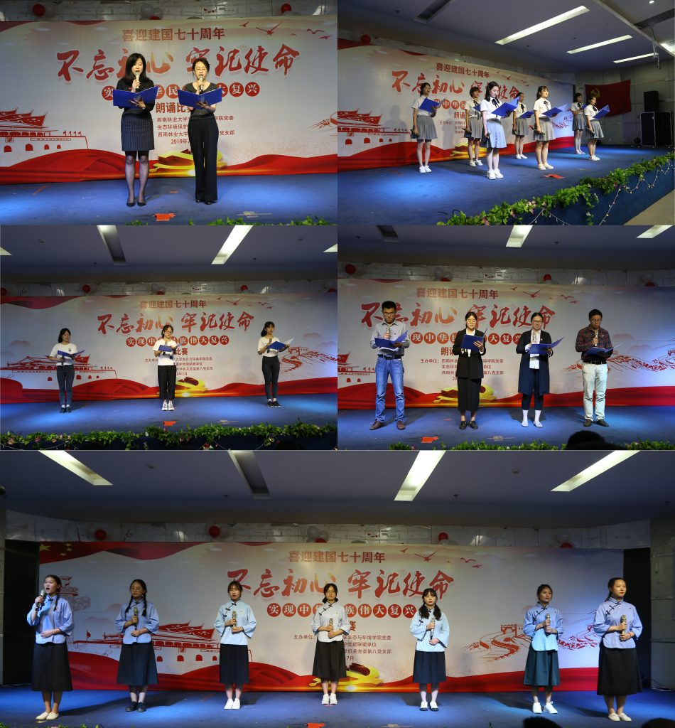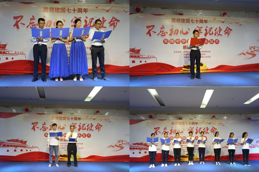 为庆祝建党98周年和新中国成立70周年,进一步深入学习贯彻习近平新时代中国特色社会主义思想,引导广大党员进一步增强“四个意识”、坚定“四个自信”、做到“两个维护”,自觉做习近平新时代中国特色社会主义思想的坚定信仰者、忠实实践者。引导广大党员练就过硬本领,把“初心”和“使命”融入到国家发展的全过程。7月5日下午,由生态与环境公司党委、校机关党委第八党支部、生态环境保护党建联盟共同主办的“不忘初心、牢记使命”喜迎建国七十周年朗诵比赛在老员工活动中心举行。校教务处处长杨思林、公司党委宣传部副部长李福源、生态与环境公司党委副书记刘建祥(主持工作)、生态与环境公司党委副书记李贵兰、生态与环境公司副经理王妍、石漠化经理陈奇伯等领导出席活动。各主办单位共计13支队伍参加了本次比赛,生态与环境公司200余名师生聆听了朗诵比赛。