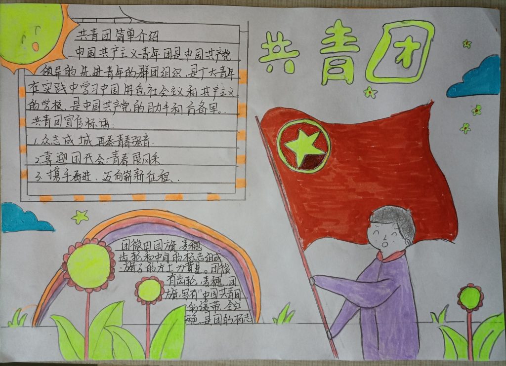 活动中,团支书开展了共青团知识问答,加强了同学们对共青团知识的了解,加深了同学们对共青团基本知识的印象。在制作手抄报环节,全班同学都积极参与到其中,按小组分工进行,画图、上色、填字,每一笔都饱含同学们对团的热爱。手抄报制作完成后,同学们积极分享所制作手抄报的含义,核心观念无不体现着党和团近百年的发展和祖国的繁荣富强。最后,我们邀请了班级内刚刚确定为入团发展对象的同学分享了自己为什么要加入中国共青团以及自己对今后生活的规划。同时,我们积极鼓励全班同学向先辈们学习,向优秀团员学习,不忘入团初心,做好未来规划,砥砺前行,在新时代新征程中留下青春奋斗的印记!随着最后一个环节的结束,本次团日活动圆满落下帷幕。