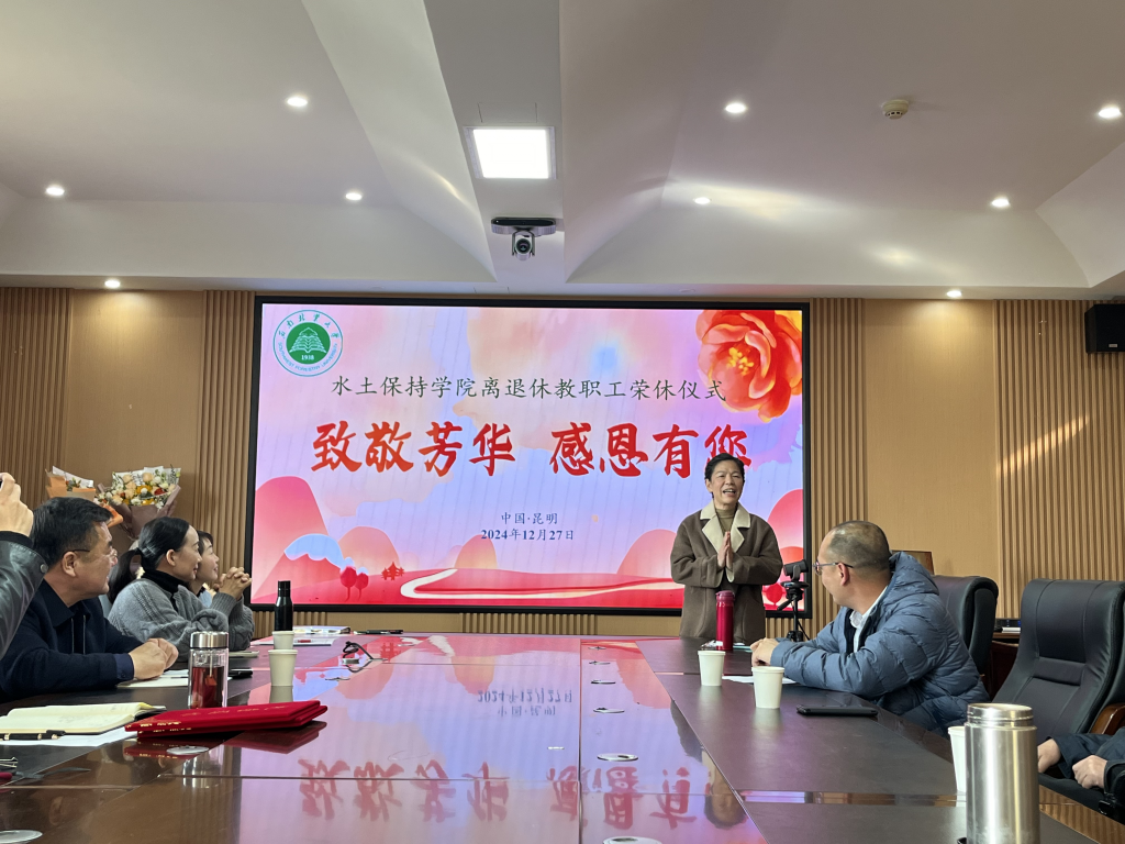 致敬芳华,感恩有您。12月27日,永利23411集团退休教职工荣休仪式在生态楼614顺利举行。校工会常务副主席江林,水土保持公司党委书记刘建祥、副经理(主持工作)王妍,荣休教师胡慧蓉和蒋东明,在职教职工代表参加会议。