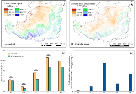 本研究基于高精度土地利用数据识别出退耕还林(草)实施区域,并以此为基础构建了“实际情景”与“气候驱动情景”的对比分析,系统量化了退耕还林(草)工程对生态系统碳固存的贡献。结果表明,该工程是区域植被碳固存增强的主导驱动力,贡献了植被净初级生产力(NPP)增长趋势的60.05%,在黄土丘陵、黄土塬等区域其影响甚至超过气候变化;工程显著提升了生态系统总碳储量,在不考虑CO₂施肥效应的情况下,每年额外增加植被碳固存4.29 Tg,并累计增加0-40 cm土层土壤有机碳储量20.45 Tg;此外,土壤碳的固存效应呈现显著的表层聚集特征,说明工程对表层土壤碳库的改良作用更为直接和突出。